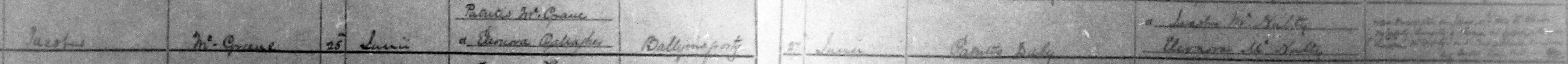 Patrick McGrane, Ballymacarrick, son of James McGrane and Catherine McCafferty, Ballynacarrick, married Ellen Gallagher, Ballymagroarty, dau of Patrick Gallagher