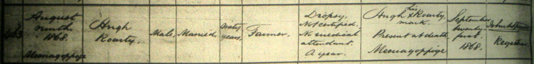 Notes: Hugh d 9 Aug 1868 aged 60 years, informant Hugh Roarty, Meenagoppoge - see death register Children of Hugh and Rose : 1. Patrick bap 15 Mar 1860, sponsors Michael Sweeney and Mary Harkin - see baptism register 2. Hugh b 1863 died 8 Jan 1865 aged 2 years 3. Margaret (Peggy) b 27 Apr 1865 - married William McMenamin, Drumdeevin, Kilmacrenan, son of John, 19 Feb 1901. Witnesses Hugh McMenamin, Drumdeevin & Bridget Ferry, Dunlewey - see 1901 census Drumdeevin for William 4. Philip b abt 1867 - married Catherine Sweeney, Drumnatinny, Raymunterdoney, dau of Patrick Sweeney. Witnesses James Gallagher, Falcarragh and Rose Sweeney, Drumnatinny, 25 Jan 1902. 4th degree consanguinity (3rd cousins) - see 1901 census Drumnatinny for Catherine's family - their son Patrick b 8 Aug 1904 5. Michael b 16 Mar 1869 d 22 Nov 1870 6. Edward b 10 Apr 1871 7. Francis b 29 Sep 1872, bap 29 Sep, Godparents John and Annie Gallagher 8. Mary b 1844, dau of Hugh, Meenagoppoge, married William McMenamin, 28, son of John, 13 Feb 1866 at Crossroads - see 1901 census Drumdeevin